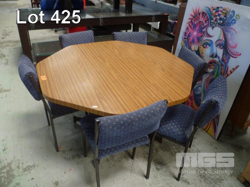 RETRO 7 PIECE DINING SUITE, INC HEXAGONAL TIMBER LAMINATE TABLE, SINGLE PEDESTAL, 6 x METAL FRAMED CHAIRS, BLUE FABRIC, (SOME STAINED, 1 x DAMAGED)