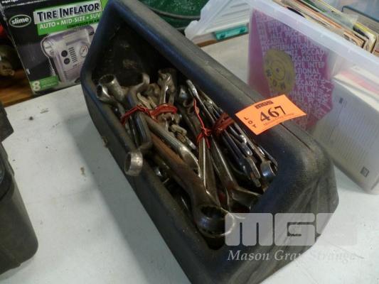 PLASTIC TOOL CADDY & CONTENTS OF ASSORTED HAND TOOLS, MAINLY SPANNERS