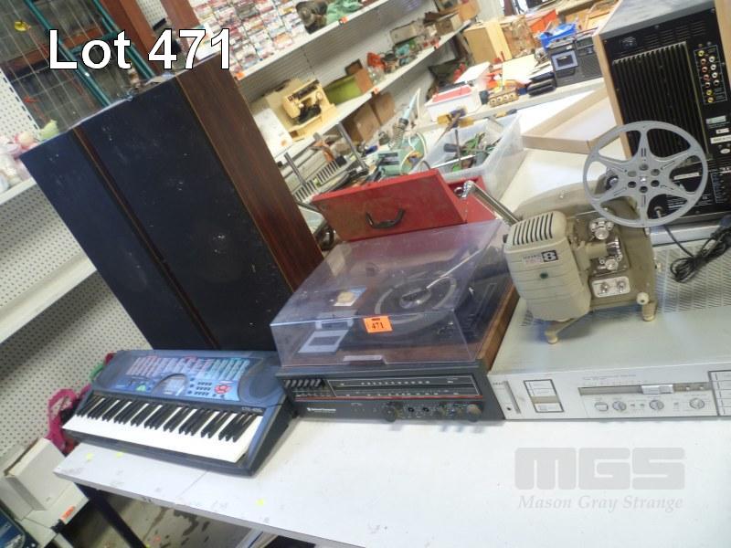 TABLE OF VINTAGE HI FI, SPEAKERS & KEYBOARD