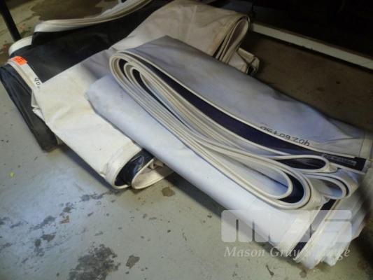 5 X ASSORTED HEAVY DUTY ADVERTISING TARPS. UNKNOWN SIZES