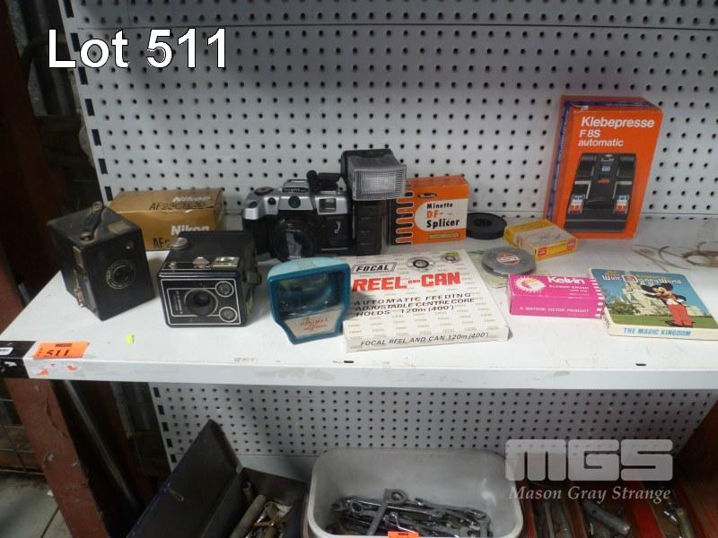 COLLECTION OF FINTAGE CAMERAS & REEL TO REEL LOT, INCL BROWE CAMERAS, WALT DISNEY THE MAGIC KINGDOM IN BOX