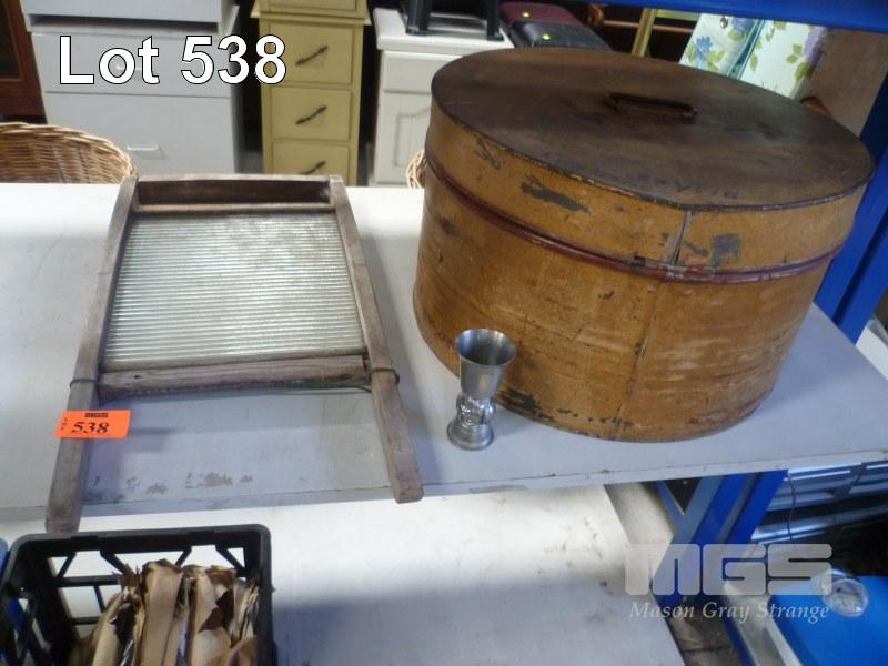 VINTAGE WASHBOARD, & ROUND METAL TRUNK