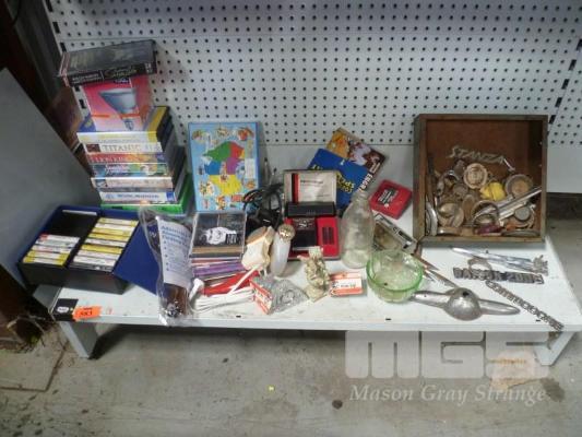 COLLECTION OF CAR BADGES, VIDEOS, CASSETTE TAPES, DEPRESSION GLASS, CDs, ETC.