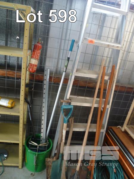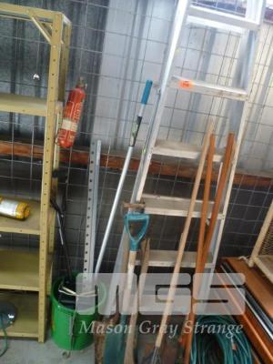 ALUMINIUM A FRAME LADDER, MOP/BUCKET & GARDEN TOOLS