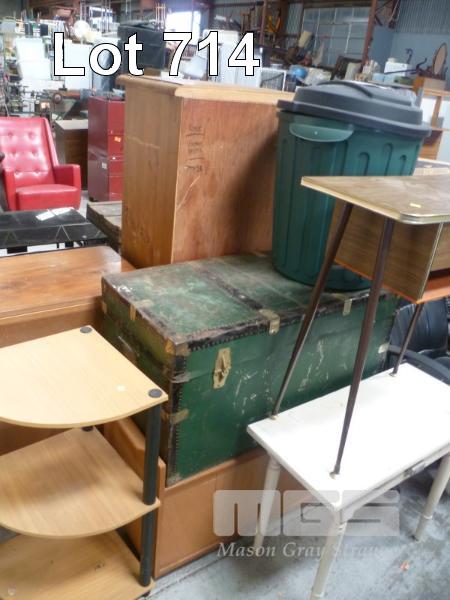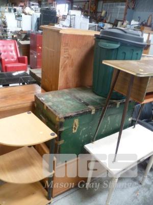 TRAVEL TRUNK, PLASTIC BIN, PHONE TABLE, SIDE TABLE, CORNER SHELF UNIT