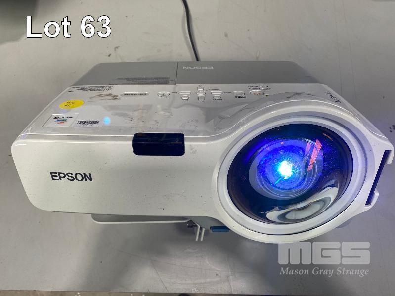 PROJECTOR, EPSON EB-410W SHORT-THROW 3LCD, 2,000 LUMENS, 913 HOURS (HIGH) & 46 HOURS (LOW) SHOWING (NO REMOTE) WITH ELPMB24 WALL MOUNT BRACKET, ELPSP02 ACTIVE SPEAKERS (NO POWER SUPPLY)