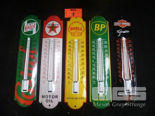 5 x RE-MADE ENAMEL THERMOMETERS INC BP, SHELL, TEXACO, CASTROL & HARLEY DAVIDSON
