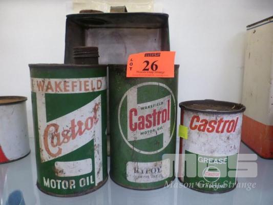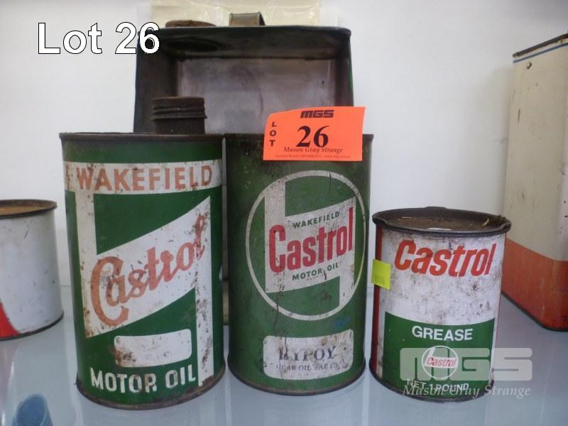 3 x CASTROL OIL TINS, INC CASTROL WAKEFIELD MOTOR OIL 1 IMP QUART, CASTROL WAKEFIELD GEAR OIL 1 IMP QUART (TOP CUT OUT) & CASTROL GREASE TIN, NET 1 POUND