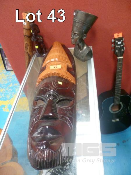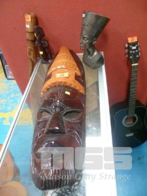NEFERTITI BUST. LARGE HAND CARVED TRIBAL MASK & HAND CARVED STANDING NATIVE WITH CODPIECE.
