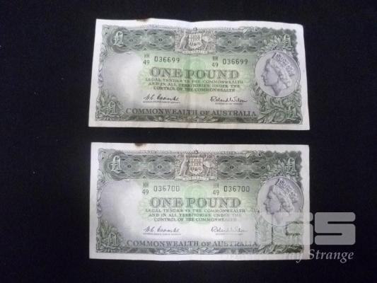 1960 2 X 1 POUND NOTE CONSEC COOMBS WILSON MARK TOP OF NOTES