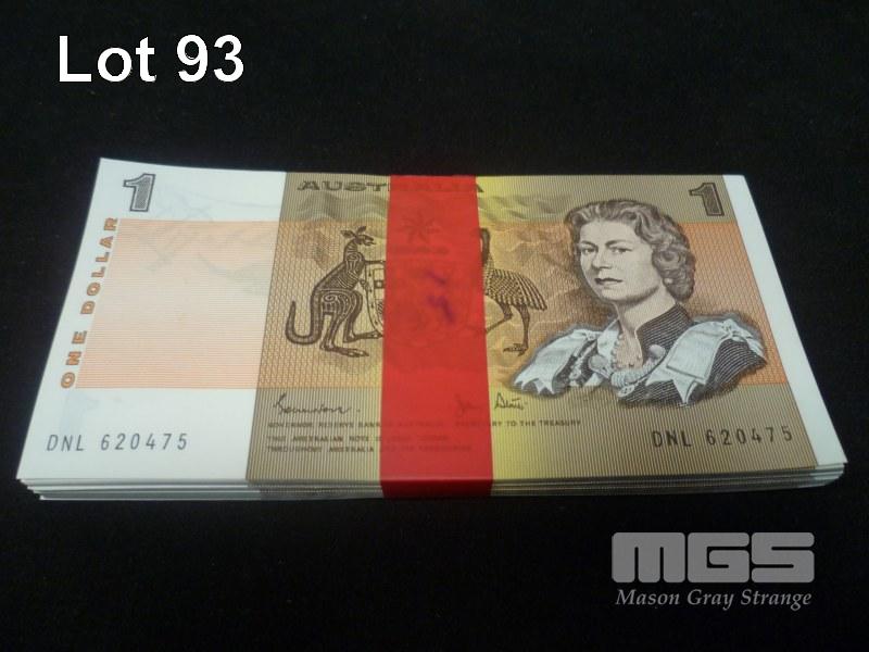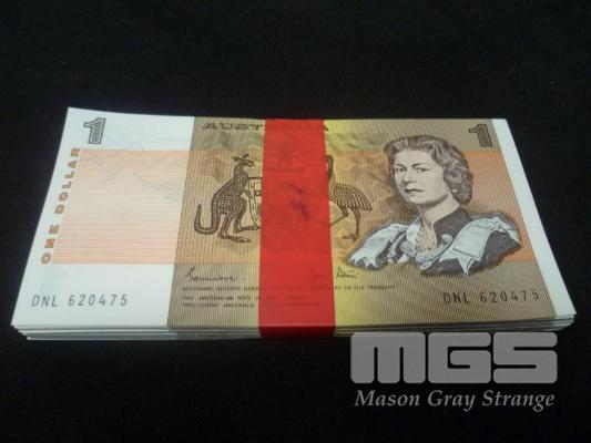 BUNDLE OF 100 AUSTRALIA $1 PAPER BANKNOTES, INCLUDIN CONSECUTIVE RUNS, DNL 6200475-500, DLJ 221551-552, DKN 956627, DKN956559, DNN 620001-070