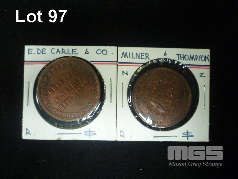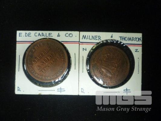 2 X PENNY TOKENS, E.DE.CARLE & Co, MELBOURNE & PLENTY VICTORIA, GROCERS & SPIRIT MERCHANTS, BRITANIA & 1881 MILNER & THOMPSONS CANTERBURY MUSIC DEPOT AND PIANO FOR THE WAREHOUSE, CHRISTCHURCH, NEW ZEALAND