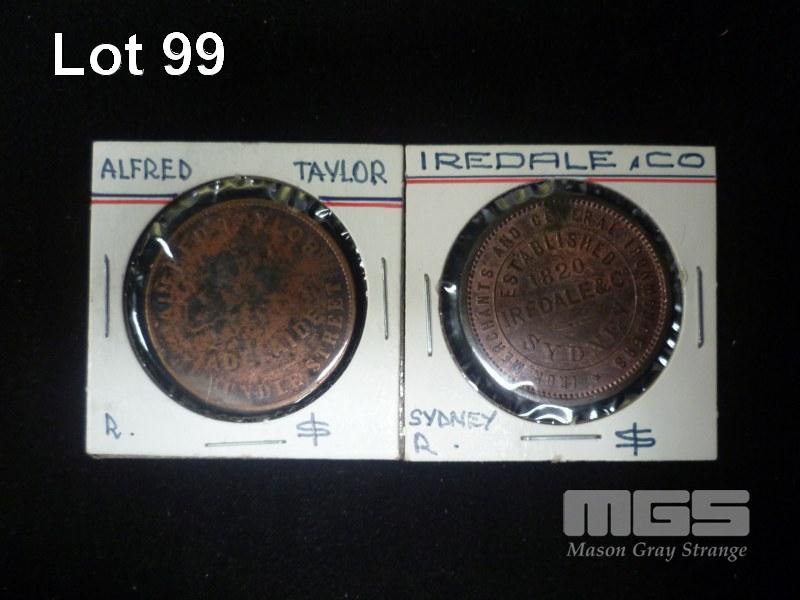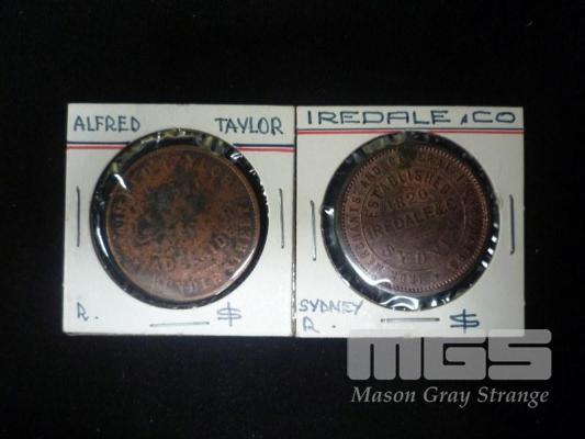 2 X PENNY TOKENS, ALFRED TAYLOR, RUNDLE ST ADEALIADE, AUSTRALIA & 1820, IREDALE & Co, SYDNEY, IRON MERCHANTS AND GENERAL IRONMONGERS, AUSTRALIA