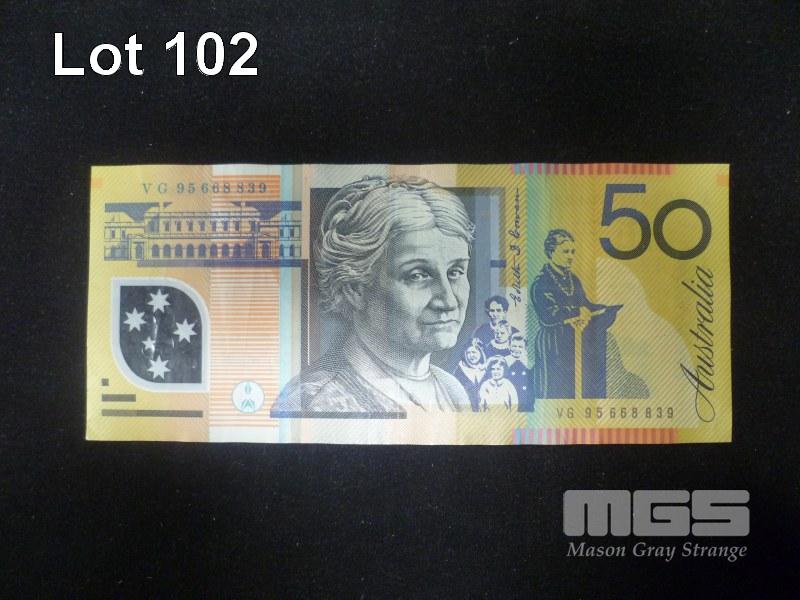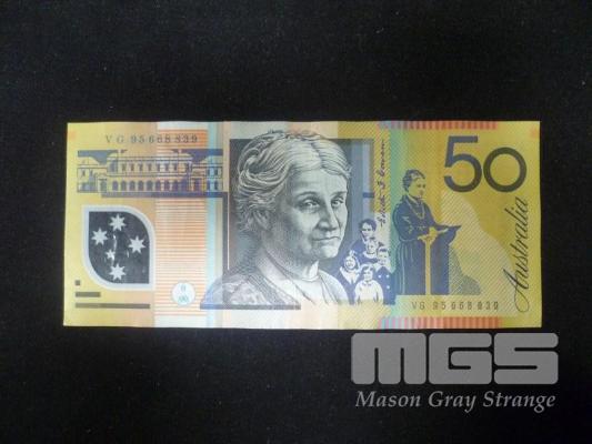 AUSTRALIA, $50 POLYMER BANKNOTE, LAST YEAR PREFIX, EVANS/FRASER, VG 95668839 (CIRCULATED)