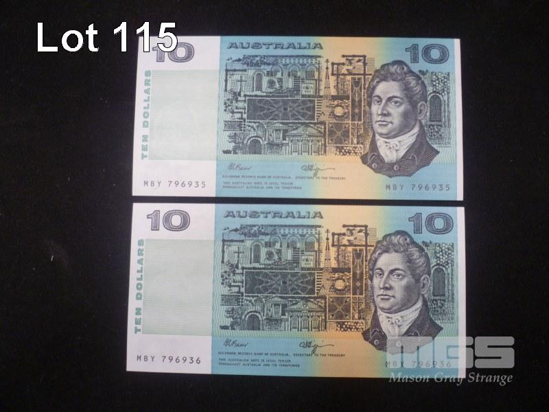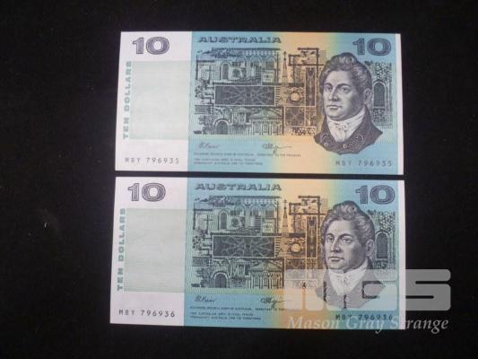 1989 2 X 10 DOLLAR NOTES CONSECUTIVE FRAZER HIGGINS APPEARS UNC