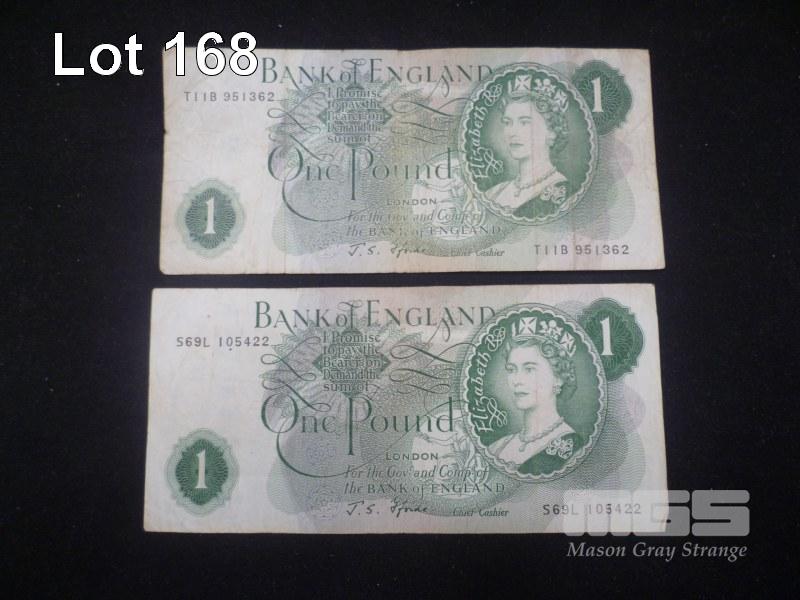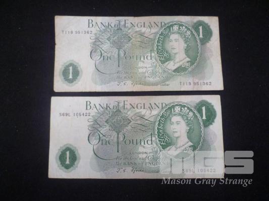 2 X BANK OF ENGLAND, ONE POUND BANKNOTES, T11B 951362, S69L 105422