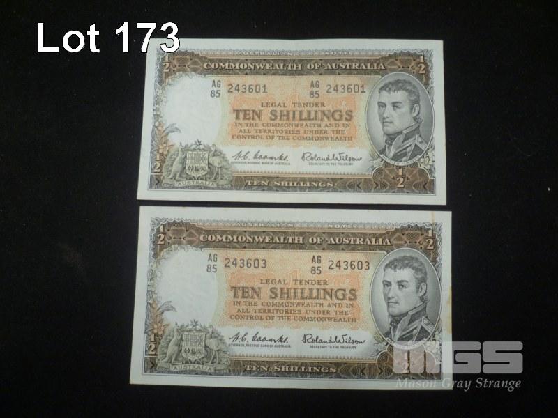 2 X COMMONWEALTH OF AUSTRALIA, TEN SHILLINGS, BANKNOTES, COOMBS/WILSON, AG85 243603, AG85 243603