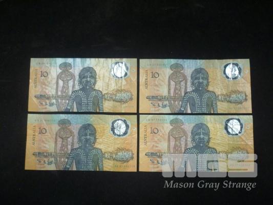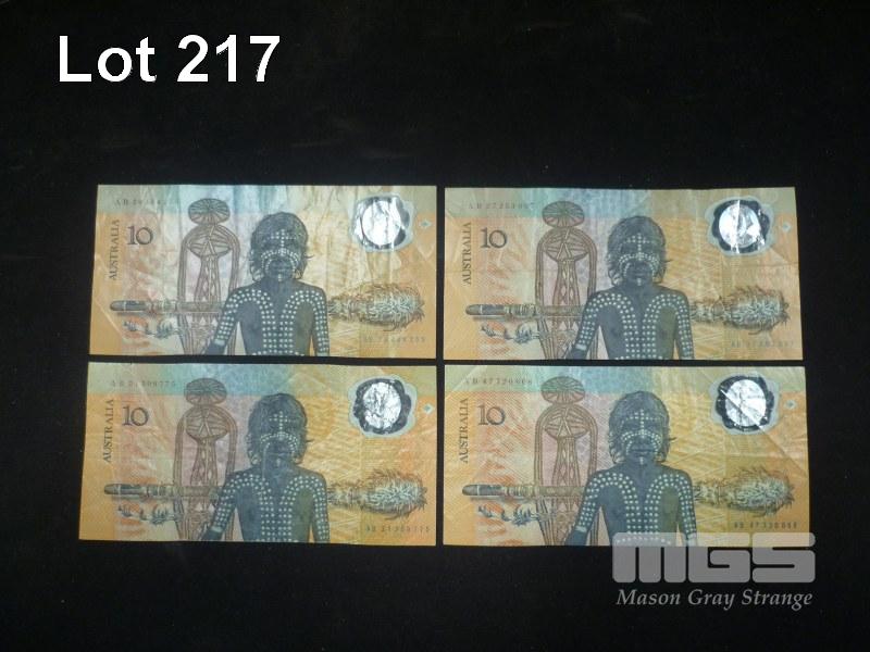 4 X AUSTRALIA 1988, COMMEMORATIVE, CIRCULATED $10 POLYMER BANKNOTES, AB 47720668, AB 21309775, AB 26454255, AB 27253097
