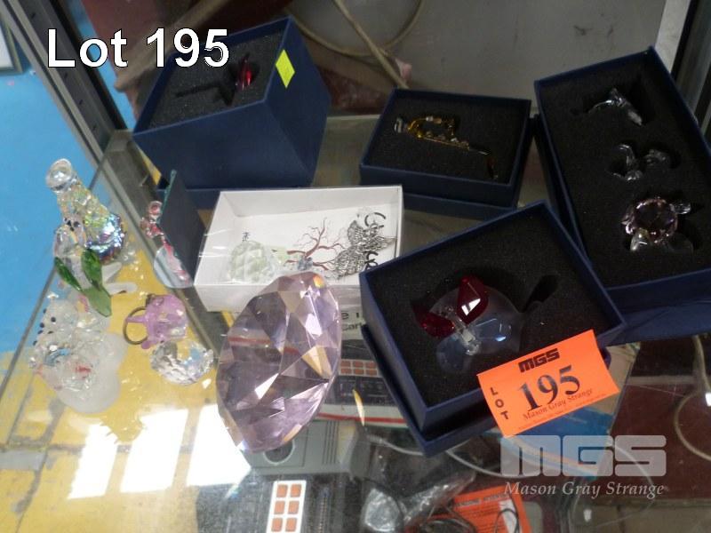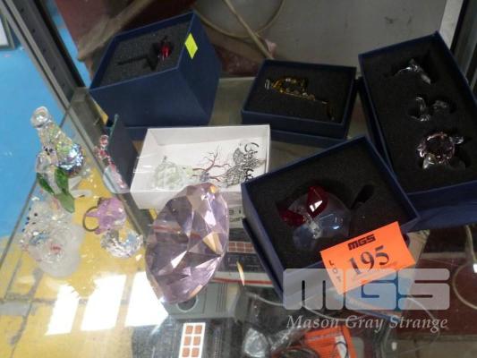 ASSORTED GLASS FIGURINES & LARGE CUT GLASS DIAMOND ORNAMENTS