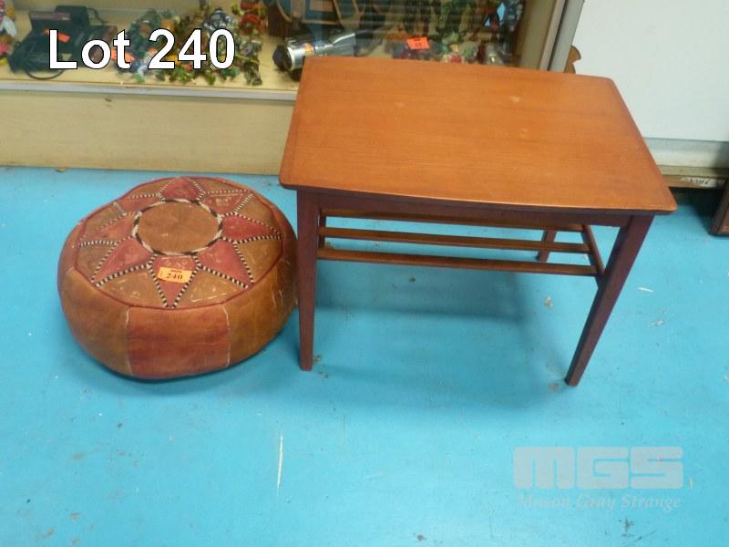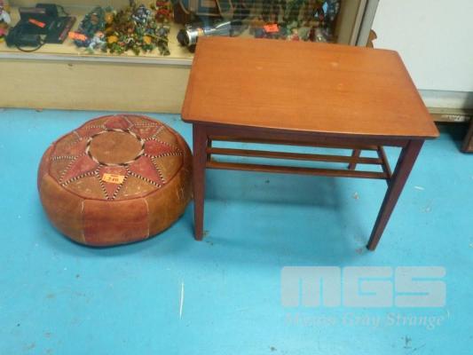 TEAK COFFEE TABLE & VINTAGE SEWN LEATHER FOOT STOOL