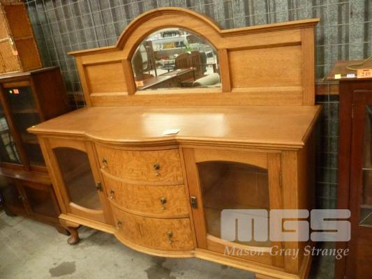 AUSTRALIAN OAK SIDEBOARD, ARCHED FRONT WITH 2 GLASS FRONTED DOORS & 3 DRAWERS, BEVELLED EDGE MIRROR TO BACK PANEL