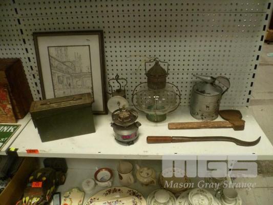 VINTAGE HAND TOOLS, OIL POURER, LANTERNS, AMMUNITION CASE, ETC