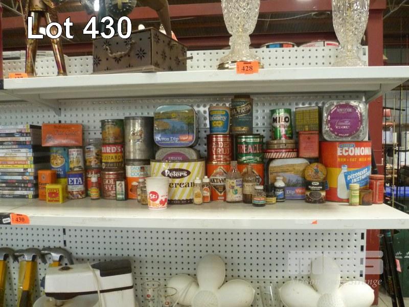 VINTAGE HOUSEHOLD PACKAGING TINS, ETC, 1 x SHELF