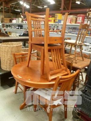 PINE 5 PIECE DINING SUITE INC ROUND TABLE, SINGLE PEDESTAL & 4 x CHAIRS