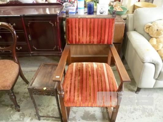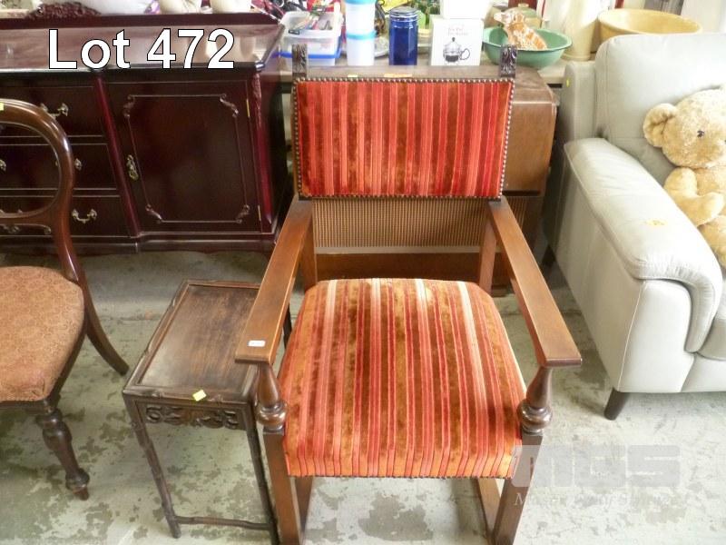 VINTAGE OAK ARM CHAIR, RED VELVET FABRIC, STRETCHER BASE & OCCASIONAL TABLE
