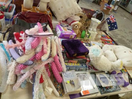 ASSORTED HOMEWARES INC COAT HANGERS, HANDBAGS, BOOKS, SOFT TOYS,ETC, 1 x TABLE