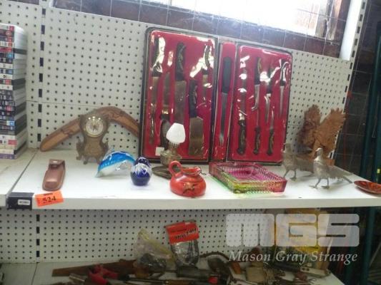 GLASS PAPER WEIGHTS, ASHTRAY, MERCEDES MANTLE CLOCK, KNIFE SET, ETC