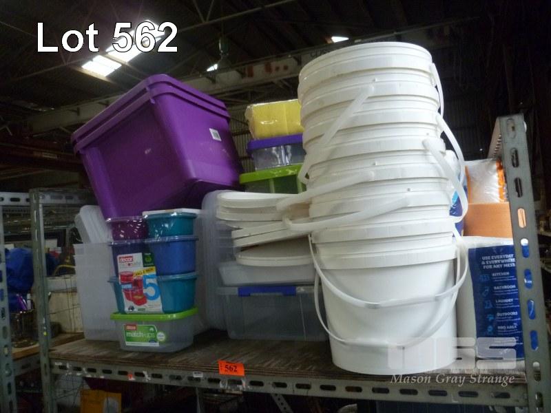 ASSORTED STORAGE CONTAINERS, BUCKETS & PAPER TOWELS, 1 x BAY