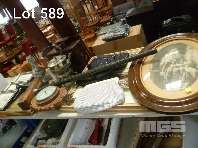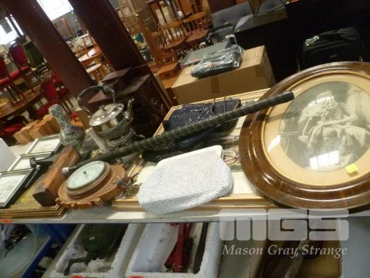 2 x FRAMED PAINTINGS, VINTAGE CURVED GLASS PRINT, CROQUET MALLET, GLOMESH HANDBAGS, ETC