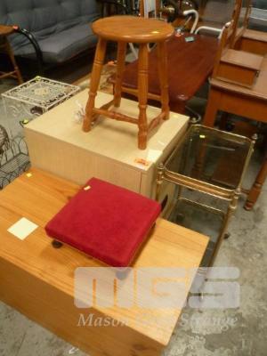 PINE BLANKET BOX, MELAMINE 2 DRAWER FILING CABINET, TRAYMOBILE & 2 x STOOLS