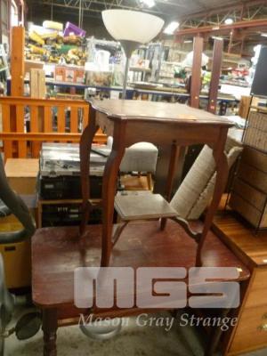 VINTAGE TIMBER DESK, SINGLE DRAWER, OCCASIONAL TABLE, BEIGE FLOOR RUG & STANDARD LAMP