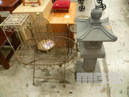 3 x WIRE PLANTER STANDS, WINE TABLE, BIRD CAGE & RESIN STATUE