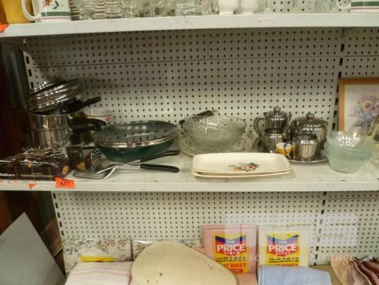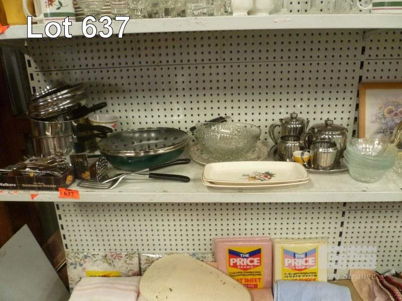 COOKWARE, CUTLERY, GLASS BOWLS, TEA SETS, ETC, 1 x SHELF