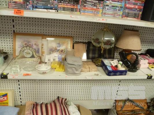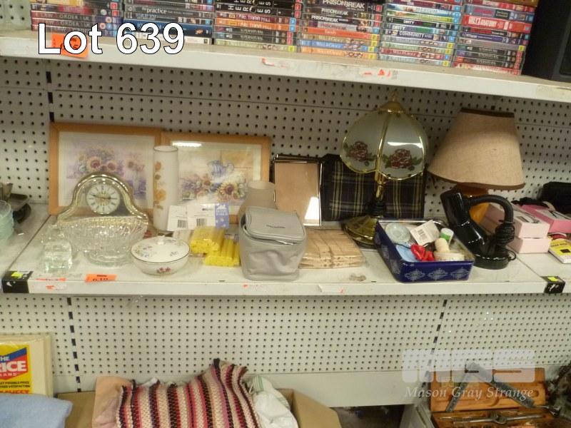 CLOCK, PICTURE FRAMES, LAMPS, BOWLS, HANDBAGS & STOCKINGS, 2 x SHELVE SECTIONS