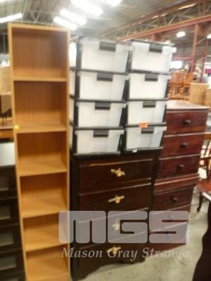 2 x 3 DRAWER BEDSIDE TABLES, 4 DRAWER TALLBOY, 2 x 4 DRAWER PLASTIC STORAGE CABINETS & 5 SHELF BOOKCASE
