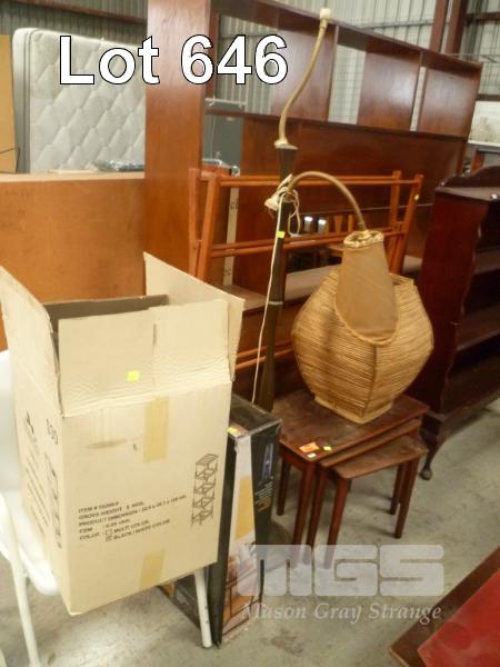 NEST OF 3 TABLES, CLOTHES AIRER, CANE BASKET, STANDARD LAMP, SHOWER CHAIR, COLUMN HEATER, & DRAWER UNIT