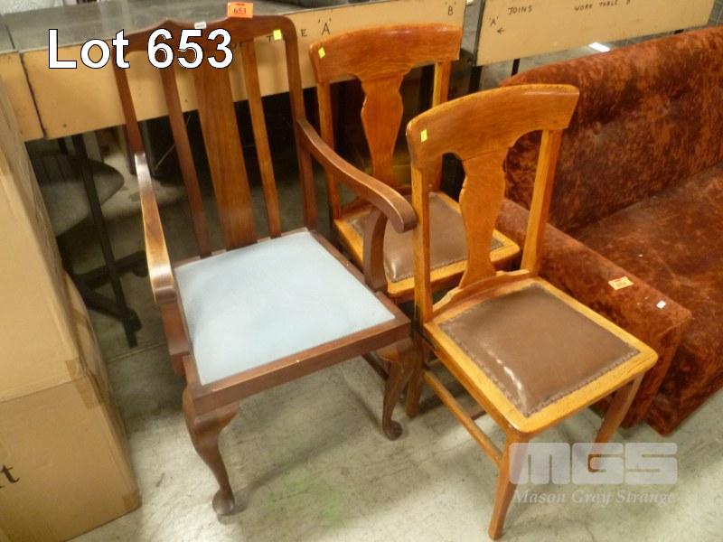 PAIR OAK DINING CHAIRS, BROWN LEATHER INLAY & CARVER CHAIR, CABRIOLE LEGS