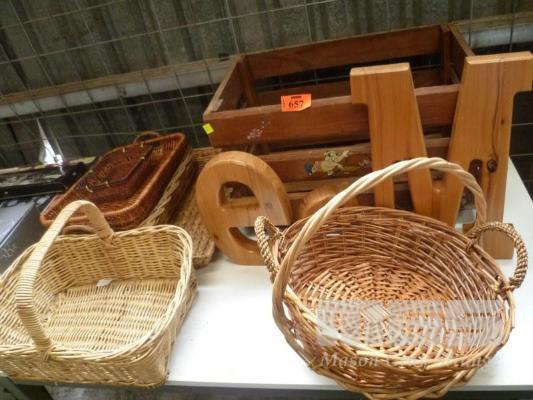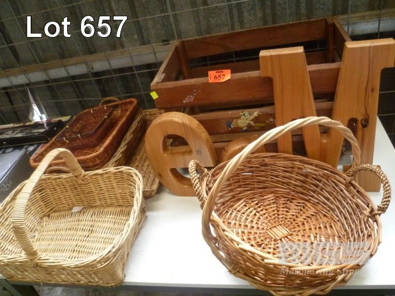 ASSORTED CANE BASKETS, TIMBER CRATE & LARGE LETTERS