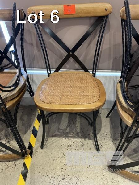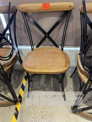 8 x RUSTIC CHAIRS, TIMBER SEAT & BACK, HEAVY RED STEEL DECORATIVE FRAMED