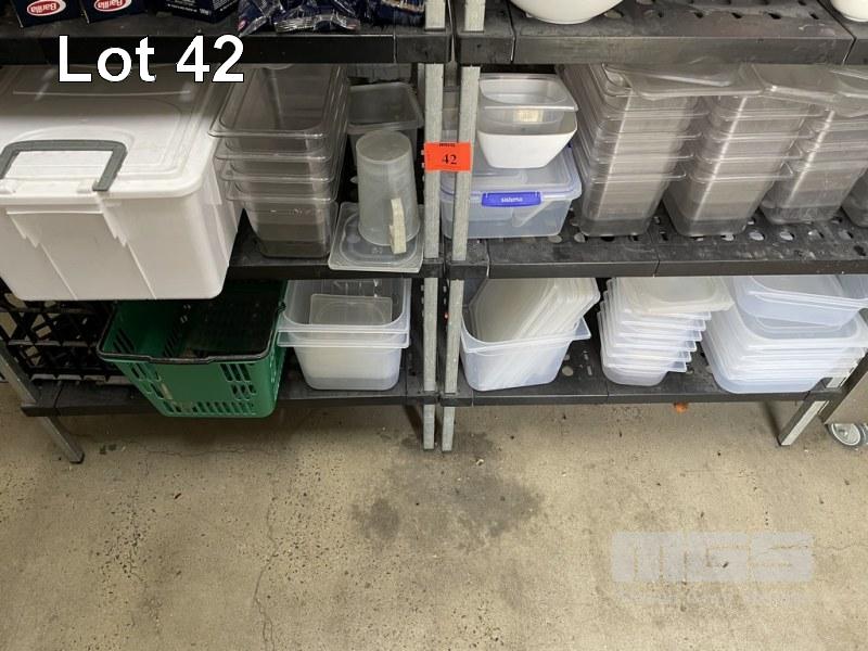 QUANTITY PVC GASTRONORM TRAYS, PVC TUBS, LIDS, ETC, 4 x SHELVES