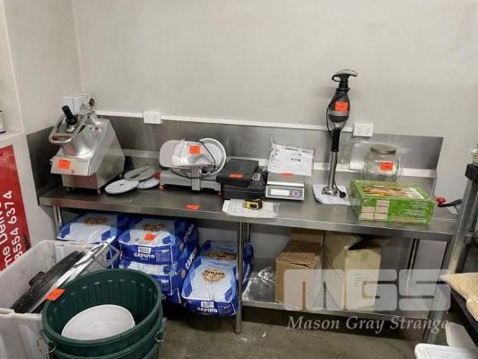 STAINLESS STEEL PREP BENCH, 2 TIER WITH SPLASHBACK 240 x 60cm & BONZER CAN OPENER
