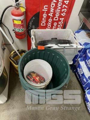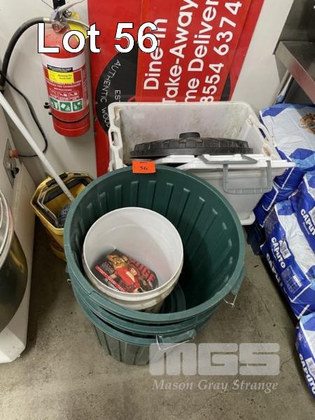 3 x RUBBISH BINS, 2 x TUBS, MOP & BUCKET