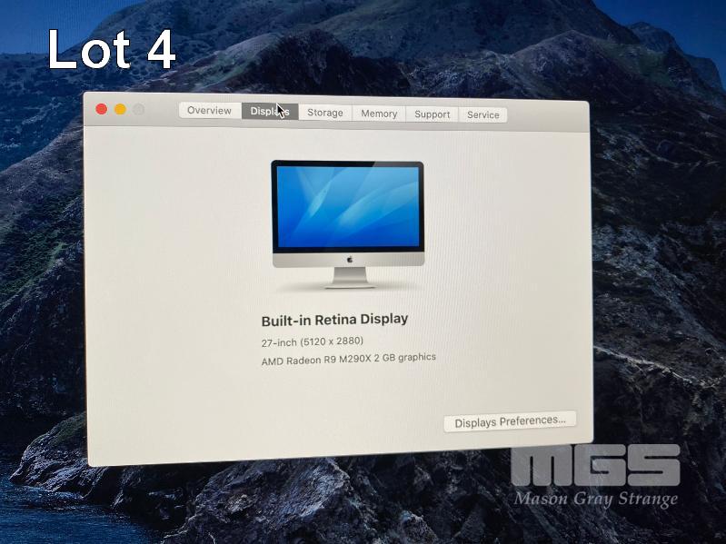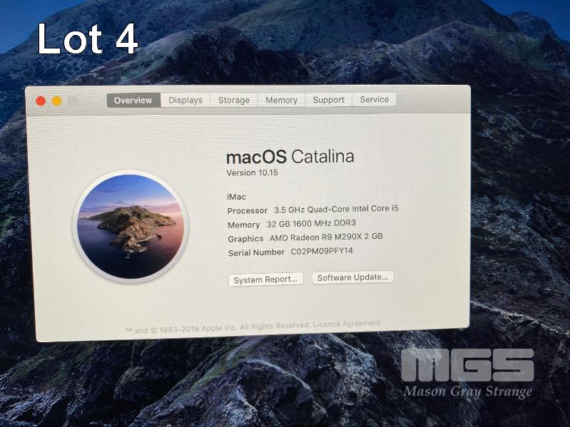 APPLE iMAC (A1419), CORE i5 4690 (4TH GEN) @ 3.5GHz, 32GB DDR3 RAM, 256GB SSD, BUILT-IN 27" RETINA DISPLAY (5120x2880), 2GB AMD RADEON R9 M290X VIDEO, Wi-Fi, MAC OS 10.15 INSTALLED (NO KEYBOARD, NO MOUSE) (NOTE: SCRATCHES ON SCREEN) S/N:C02PM09PFY14