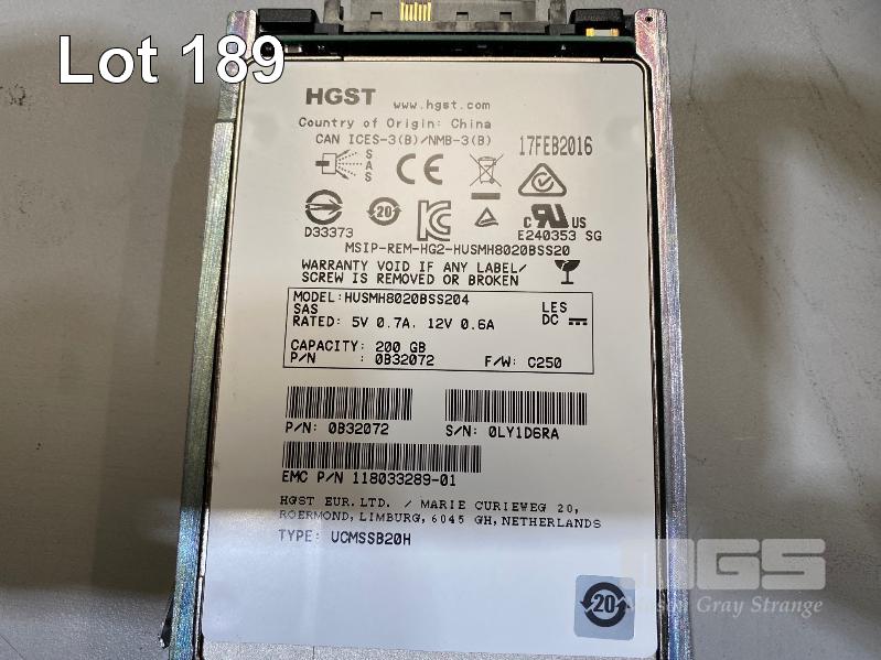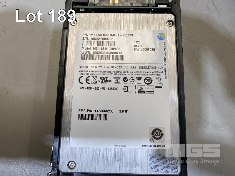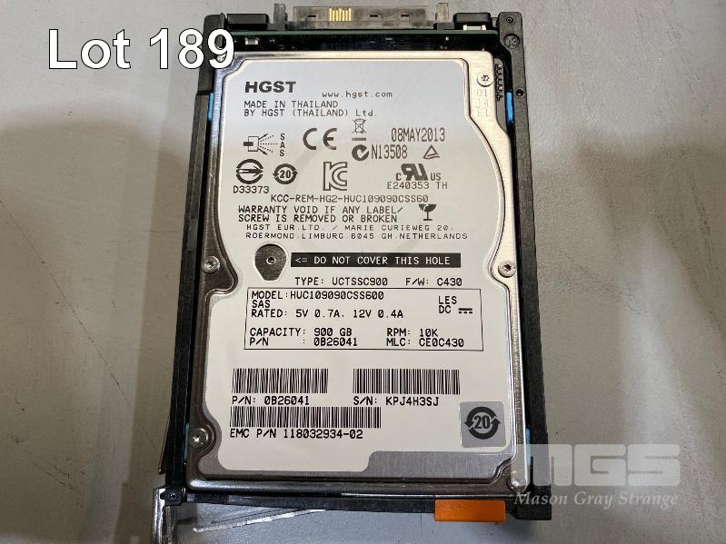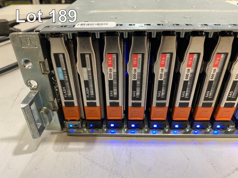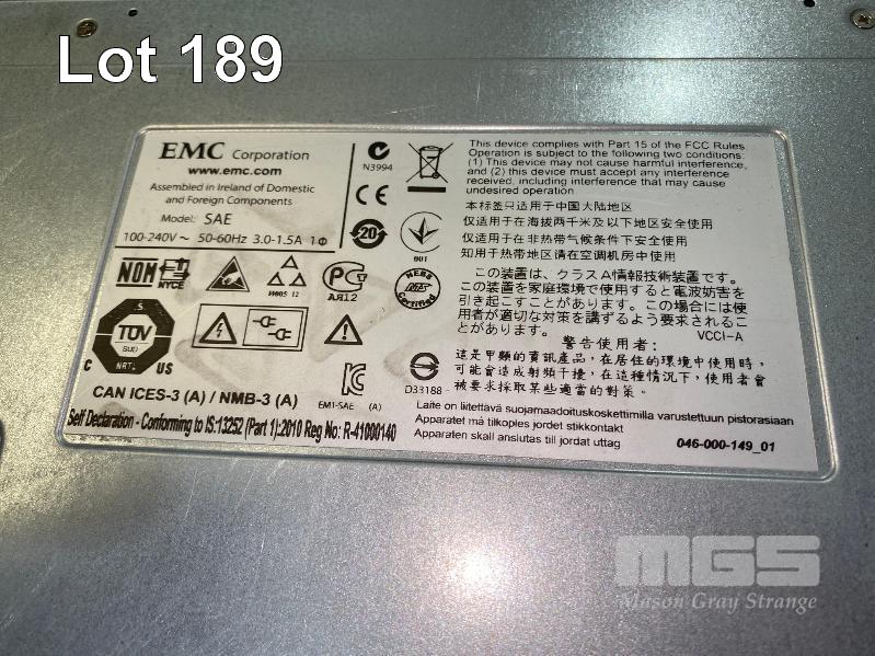RACKMOUNT STORAGE DISK ARRAY ENCLOUSRE, EMC, MODEL SAE, 2U, WITH 1 x 900GB SAS HDD, 22 x 600GB SAS HDD, 1 x 200GB FLASH HDD, 1 x 100GB FLASH HDD, 2 x 6GB SAS LCC CONTROLLER CARDS (303-104-000E), 2 x 400W PSU (071-000-541) (NO CABLES) S/N:JWXED133901893, JWXEC133901399