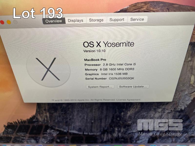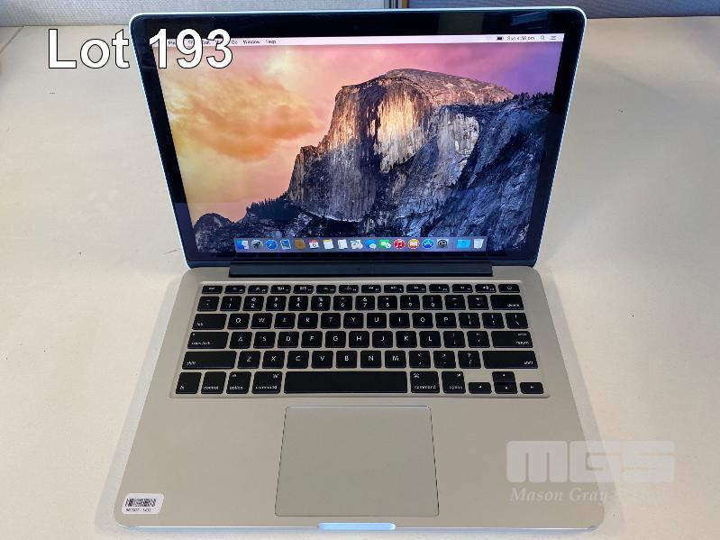 LAPTOP, APPLE MACBOOK PRO (A1502), CORE i5 4308U (4TH GEN) @ 2.8GHz, 8GB DDR3 RAM, 512GB SSD, 13.3" WIDESCREEN (2560x1600), INTEL HD VIDEO, Wi-Fi, MAC OS 10.10 INSTALLED & POWER SUPPLY (NOTE: MARKS ON SCREEN) S/N:C02NJ0U0G3QK