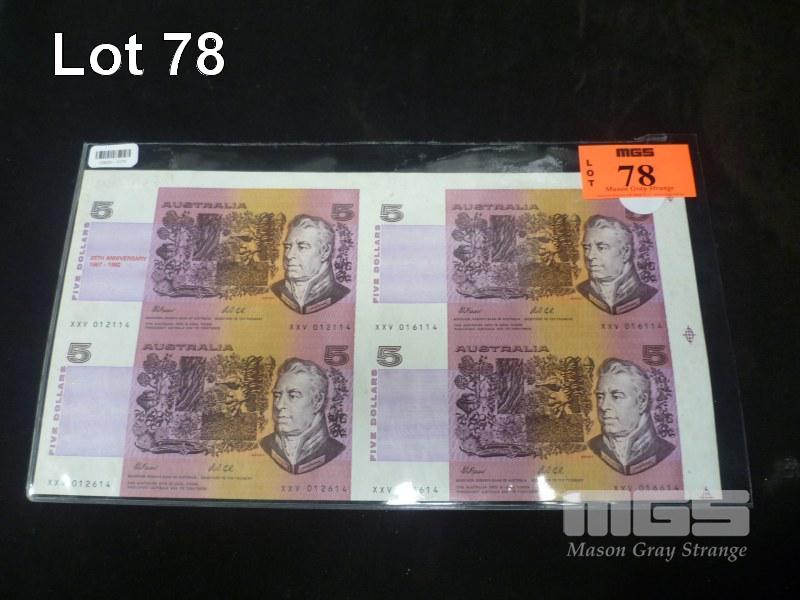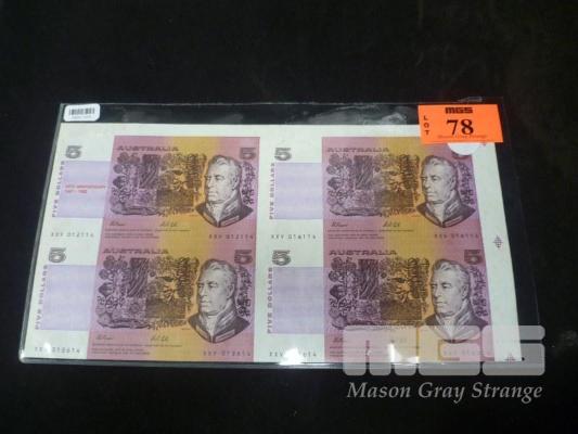 1992 UNCUT BLOCK OF 4 x $5.00 NOTE 25 ANNIVERSARY WITH SELVEDGE
